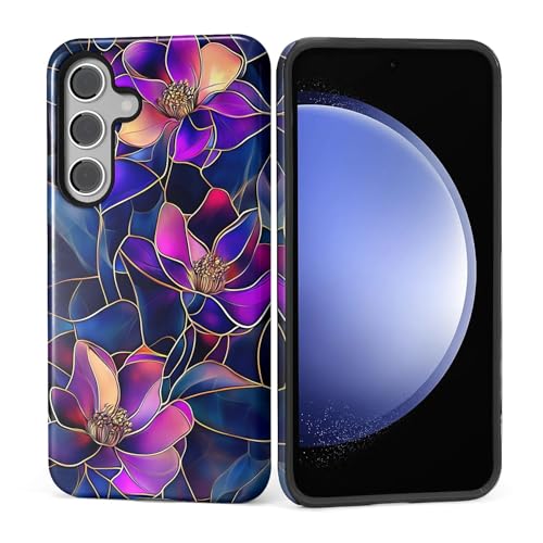 Kapadiy Case for Samsung Galaxy S25 Case,Stained Glass Purple Flower Design - Hybrid Dual Protection Silicone + Hard PC Shockproof Full Body Cover Protective Case for Men Women
