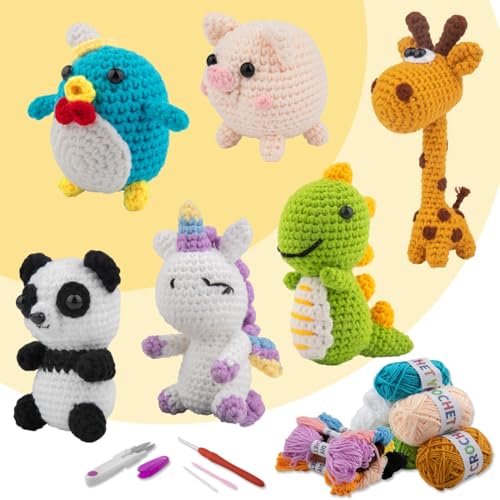 KIECIK 6Pcs Crochet Kit for Beginners, Crochet Animal Kits,Knitting Kit for Adults with Step by Step Videos Tutorials, Knitting Kit Great Birthday Holiday Gift, DIY Keychain Pendants(Set -02)