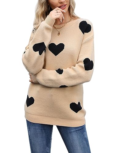 Drvitor Women’s Pullover Sweaters Long Sleeve Crewneck Casual Pullover Cute Heart Pattern Knitted Sweater (Beige&Black,Large)