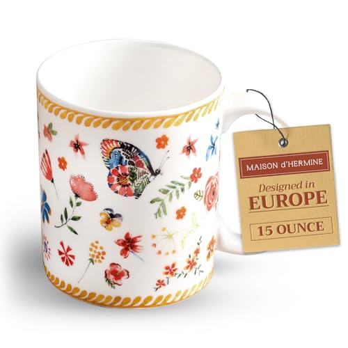 Maison d' Hermine Coffee Mug with Handles Fine Bone China Mugs Pack of One Tea Cups for Hot Beverages Cappuccino Latte Home Office Perfect for Gift (Happy Florals - Sweety Summer Morning, 15 Ounce)