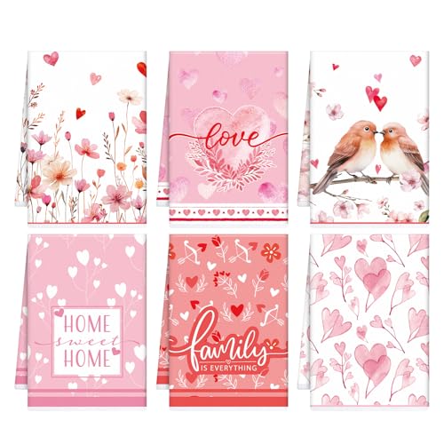 VISSTREE Valentines Day Kitchen Towels, 6 PCS Pink Heart Love Valentine's Dish Towels, Absorbent Dish Cloth Hand Towel for Kitchen Anniversary Wedding Valentines Decoration Housewarming Gifts