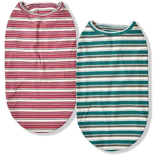 Knuffelen Dog Shirts Vest Cotton Striped T-Shirt, Sleeveless Stretchy Pet Clothes for Small Dogs, 2-Pack Soft Breathable Puppy Tank Top Cat Tee (X-Small, Pine Green,Plum Red)