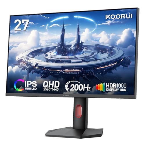 KOORUI Monitor, 27” Mini-LED IPS Panel 200Hz Gaming Monitor,1440P PiP/PBP Computer Screen, 1ms HDR 1000 Display, 97% DCI-P3, Height Adjustable, HDMI/DisplayPort, S2721PM