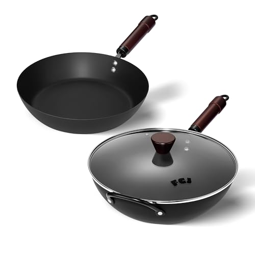 FGJ 13 Inch Wok and 12 Inch Sikllet, Cookware Set, Carbon Steel Woks &Stir-fry Pans Nonstick and Frying Pan, Pre-Seasoned 5.8QT Flat Bottom Chinese Paella Pan, Compatible with All Cooktops