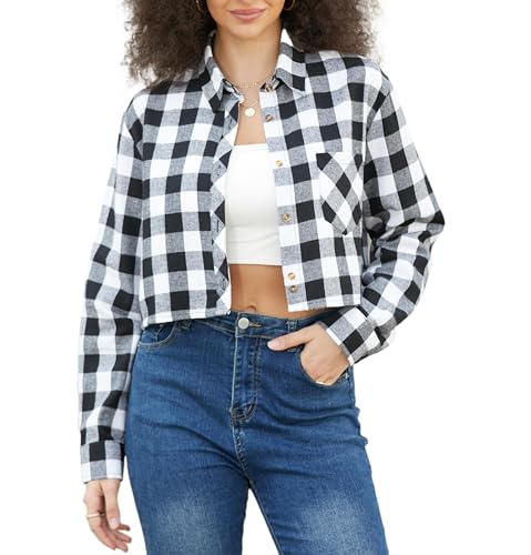 SANGTREE Womens Crop Plaid Shirts Long Sleeve Button Down Cropped Top Blouse Black White Plaid, Medium