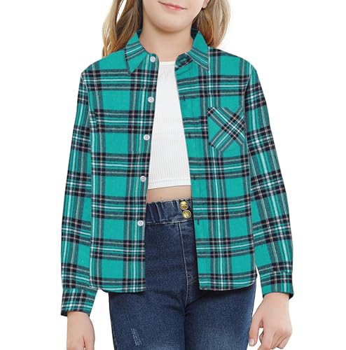 SANGTREE Girls' Long Sleeves Button Down Plaid Flannel Shirt Blouse for Children Little and Big Girls, Sea Blue Plaid, 12-13 Years = Tag 180
