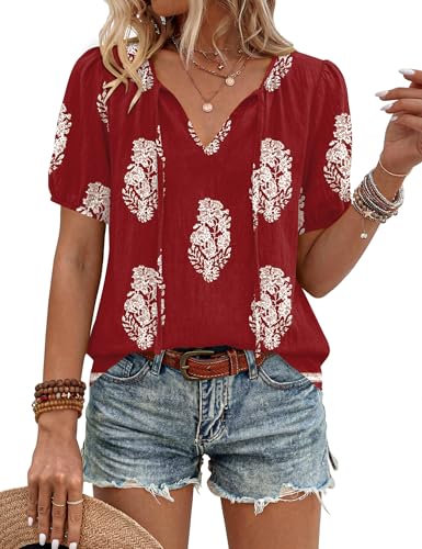 LOMON Womens Tops Casual Lantern Short Sleeve Linen Shirts V Neck Hippie Clothes Country Concert Outfits (Red Apricot Floral,S)
