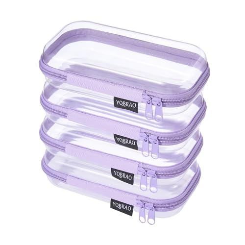 YQBRA 4 Pack Clear Hard Shell Zipper Case, See-Through Hard Plastic Organizer Pouches with Zipper for Travel, Toiletries, Makeup, Electronics & Pencils - Crush-Resistant Storage (S Purple)