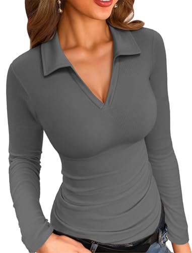 VICHYIE Womens Long Sleeve Shirts Lapel V Neck Slim Fitted Fall Clothes Ribbed Knit Collared Tshirt Trendy Polo Tops Grey S