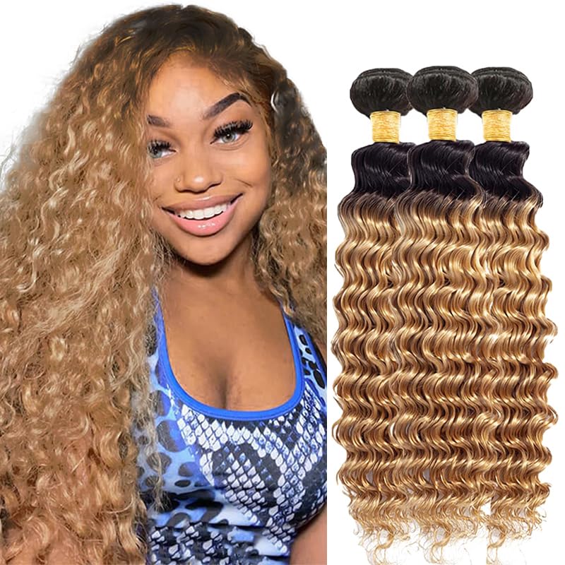 Ombre Deep Wave Bundles 1b/27 Human Hair Bundles 24 26 28 Inch Honey Blonde Bundles 8A Grade Brazilian Virgin Remy Blonde Wet and Wavy Bundle