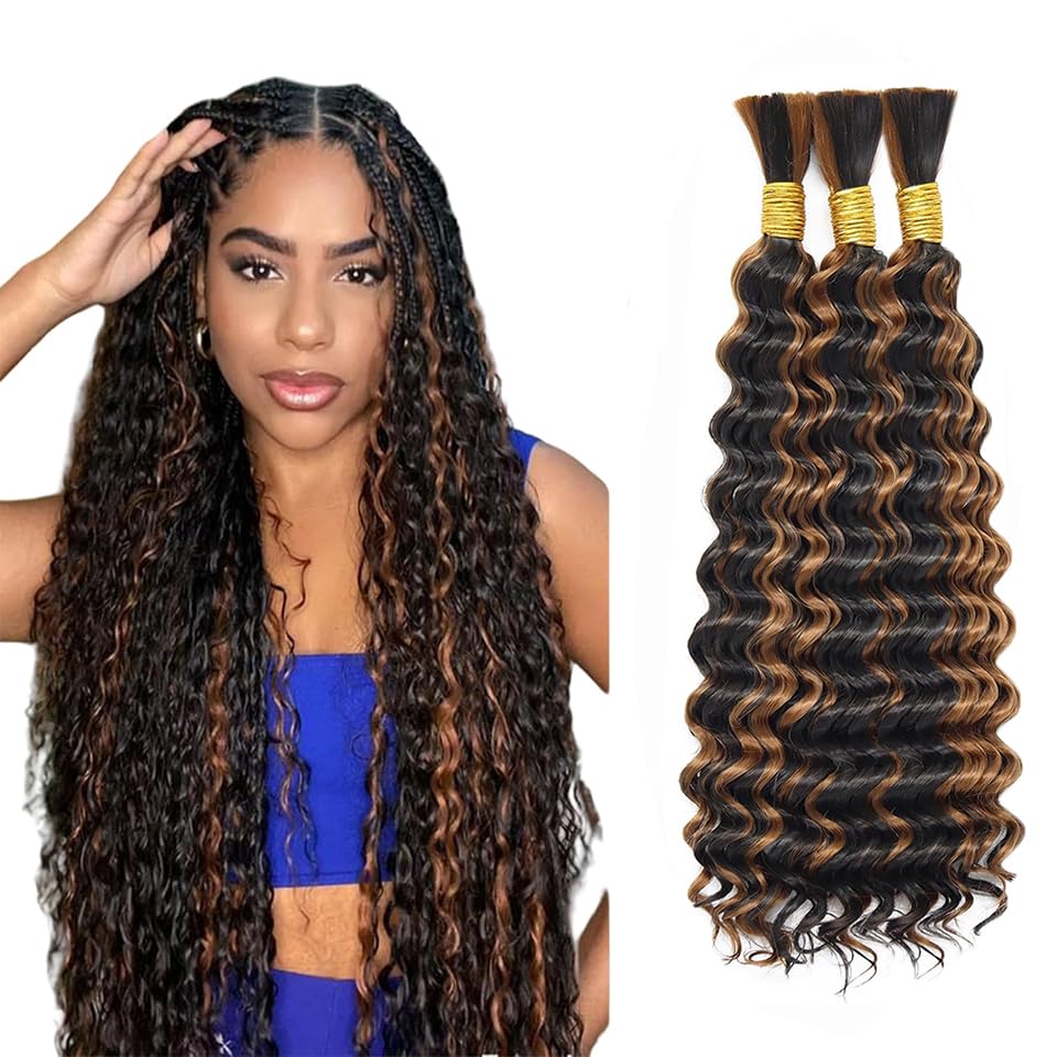 34 34 34 Inch P430 Highlight Brown Human Braiding Hair for Boho Braids 3 Bundles 150g 2 Tone #30 and #4 Brown Deep Wave Braiding Hair for Bohemian Knotless Braids Bundles