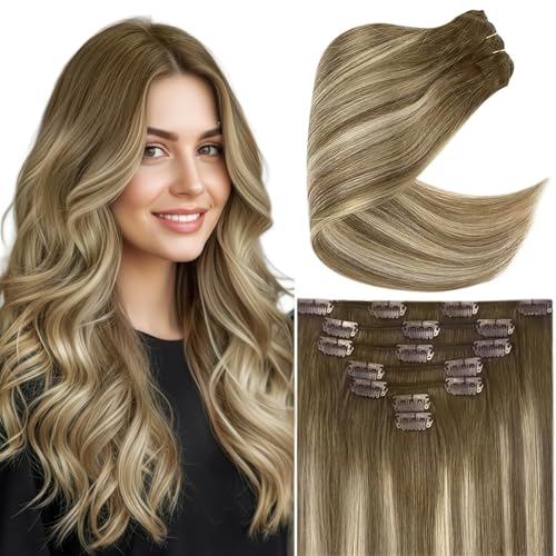 Ve Sunny Real Hair Extensions Clip in Human Hair Balayage Ombre Clip on Hair Extensions for Women Light Brown Mix Blonde Remy Human Hair 20 Inch 7pcs 120g