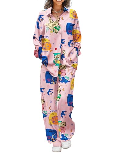 Ekouaer Womens Satin Silky Pajama Set 2 Piece Print PJs Soft Loungewear Button Down Sleepwear with Elastic Waist Long Pants Pink Pigeon XXL