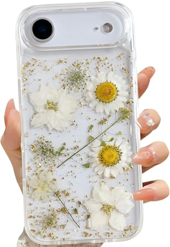 LSEEKA for iPhone Air Clear Case with Pressed Real Flowers Design,Glitter Cute White Floral Pattern Slim Soft TPU Protective Women Girl's Phone Cover for iPhone 17 Air