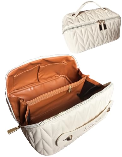 VIDIBESTY Travel Makeup Bag for Women, Large Capacity Cosmetic Bags for Girls, Compact Pouch Make up Organizer, Waterproof Toiletry Bag with Divider and Handle (White)