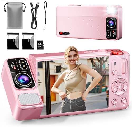 ZEOUPT Digital Camera, 4K 64MP Cameras for Photography, 270°Flip Screen Vlogging Camera, Autofocus, Flash, 18X Zoom, 2 Batteries, 64GB Card, Point and Shoot Digital Cameras for Kids Teens, Pink