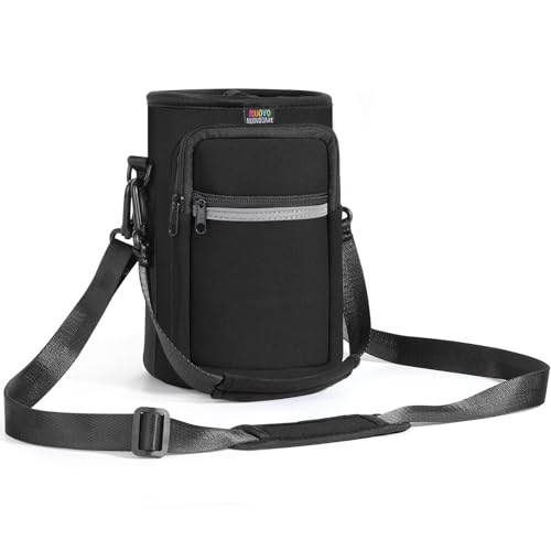 Nuovoware Water Bottle Carrier Bag, 64oz Bottle Pouch Holder, Adjustable Shoulder Hand Strap 2 Pocket Sling Neoprene Sleeve Sports Accessories for Hiking Travelling Camping, Coal Black