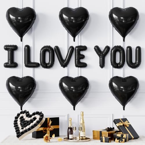 Black I Love You Balloons Kit, Large Foil Black Heart Balloons with Love Letter Banner Balloon, Modern Valentines Day Decorations for Romantic Surprise, Anniversary, Proposal