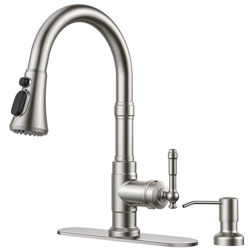 FORIOUS Vintage Kitchen Faucet with Soap Dispenser and Pull Down Sprayer, Brushed Nickel High Arc Single Handle Stainless Steel Classic Sink Faucet for Farmhouse Camper Rv Bar, Fit for 1 or 3 Hole