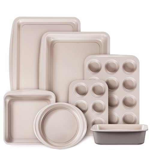 CAROTE 7-Piece Nonstick Stackable Baking Pans Set - Bakeware Sets Including Cookie Sheets for Baking, Muffin Pan, Bread Pan, Cake pan, Loaf Pan, Roasting Pan, Gray & Khaki