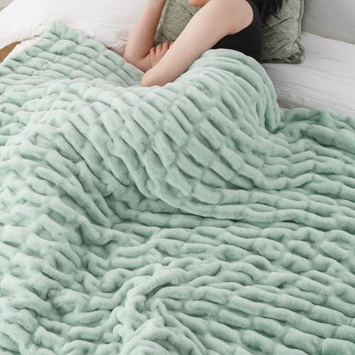 BATTILO HOME Faux Fur Throw Blanket for Couch, Super Soft Cozy Blanket, Double Side Ruched Rabbit Fur Blanket for Bed, Living Room, 60"x80", Sage Green