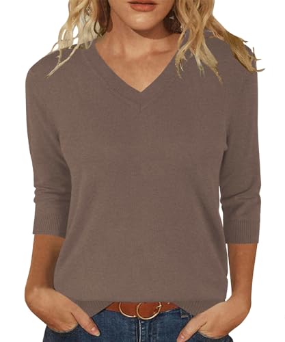 JomeDesign Chocolate Brown Fall Clothes V Neck 3/4 Sleeve Tops Trendy Knit Fall Sweaters for Women