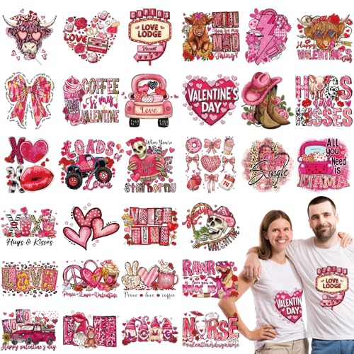 Fullhawl 30 Pcs Valentine Iron on Transfers Patches Love Heart Dtf Western Ready to Press Heat Transfers Highland Cow Vinyl Stickers Appliques for T-Shirt Clothes Backpack Bag Pillow Cover(Retro)