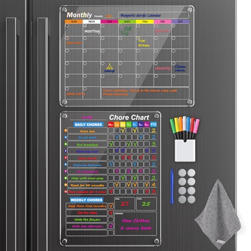 Clear Magnetic Acrylic Dry Erase Calendar for Fridge, Monthly & Weekly/Chore Chart Planning Board Set for Kids/Adults/Teens, Includes 7 Colorful Markers, 16"x12"