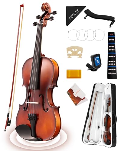 Fesley Violin Fiddle Full Set: 4/4 Matt Violin Kit for Beginners, Acoustic Violin with Hard Case, Solidwood Hand Made Starter Kit with Bow, Shoulder Rest, Tuner, Extra Strings