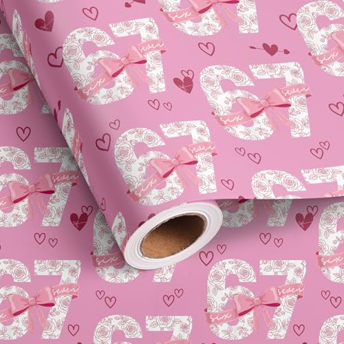Altarho 67 Valentines Day Wrapping Paper Roll, Pink Rose 6 7 Words Design Love Heart Bow Gift Wrap for Couple Teens Kids Adults, Holiday Party,Total 28.5sq.ft