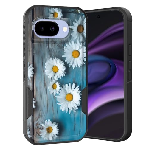 KJFHDJFDH for Pixel 9a Case,Dual Layer Hybrid Heavy Duty Rugged Shockproof Hard PC +Soft Silicone Protective Case for Google Pixel 9a 6.3 inch 2025,Daisy Flowers on Old Wooden
