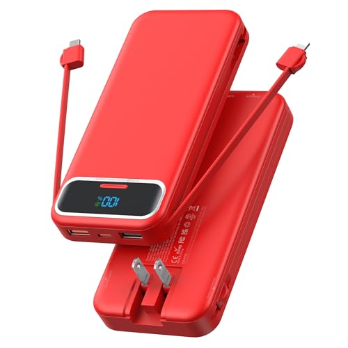 Portable Charger, 12000mAh 22.5W Fast Charging Power Bank with Built-in Cables & Wall Plug, USB C External Battery Pack with LED Display, Travel Essential Charging Bank for iPhone, iPad, Samsung Red