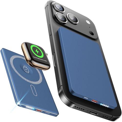 pretybuy 5000mAh for Magsafe Power Bank Slim 22.5W 3-in-1 Magnetic Battery Pack Fast Charging USB C in Out Powerbank, Mini Wireless Portable Charger for iPhone 17 16 15 14 13 12 Watch Android Blue