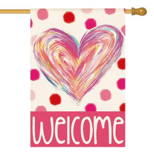 AVOIN colorlife Valentines Day Love Heart House Flag 28x40 Inch Double Sided Outside, Polka Dots Welcome Anniversary Yard Outdoor Flag