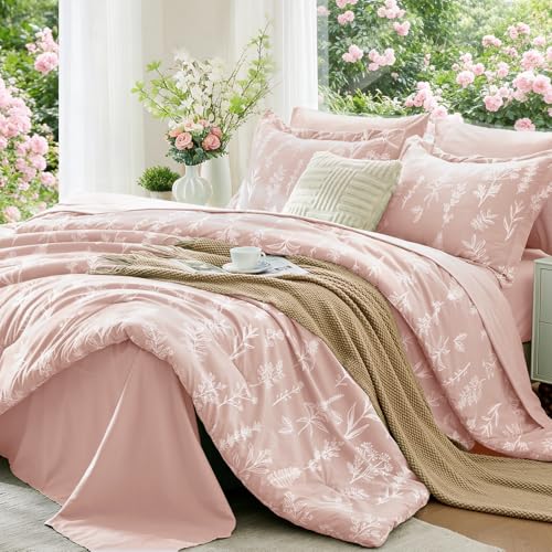MUXHOMO Cameo Pink Full Comforter Set, Elegant Floral Print Bed in a Bag 7 Pieces, Ultra Soft & Breathable Reversible Botanical Pattern Bedding Set with Comforter, Sheets, Pillowcases, and Shams