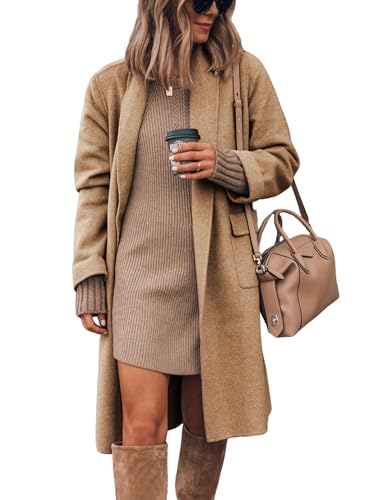 Hooever Women's Long Cardigan Wool Coat Open Front Pockets Warm Lapel Jacket Coat Fall Outerwear (Khaki-Medium)