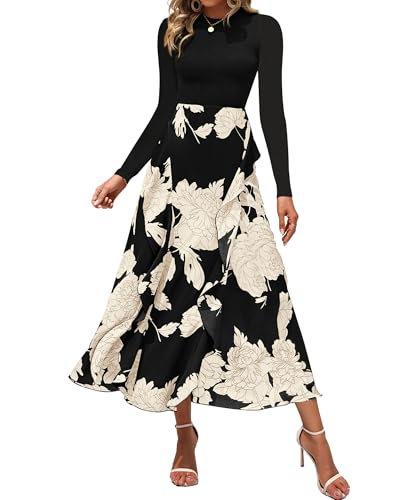 BTFBM Womens Floral Maxi Dress Fall 2025 Casual Crewneck Long Sleeve Ruffle Flowy Cocktail Wedding Guest Dresses(White Floral Black, X-Large)