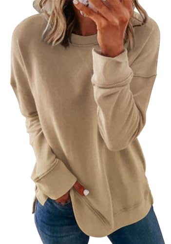 Smile Fish Women's Crewneck Sweatshirt Long Sleeve Side Split Tunic Tops Relaxed Fit Fall Shirts Cotton Blend Beige Tan,S