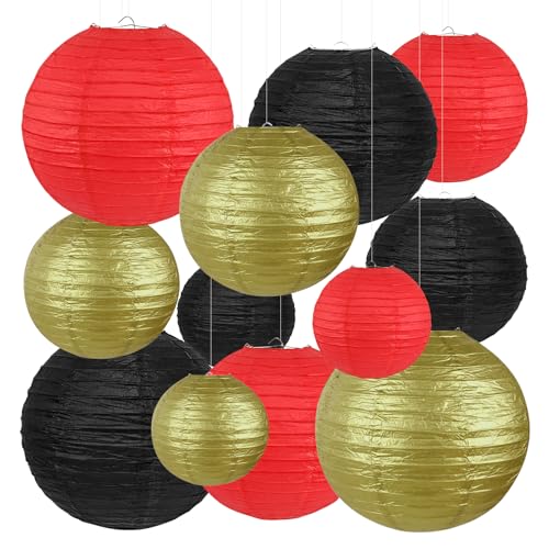 Peywot 12Pcs Round Paper Lanterns Assorted Sizes (6" 8" 10" 12") for Home Decor, Wedding, Birthday, Hibachi Party, Casino Theme Party Decorations, Hanging Chinese Japanese Paper Lamps (Black Red Gold)