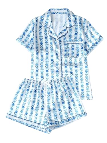 BEAUDRM Women's 2 Piece Satin Pajama Set Leopard Button Front Short Sleeve Cheetah Collar Shirt and Shorts Sleepwear Set Pjs Blue and White Shell Large
