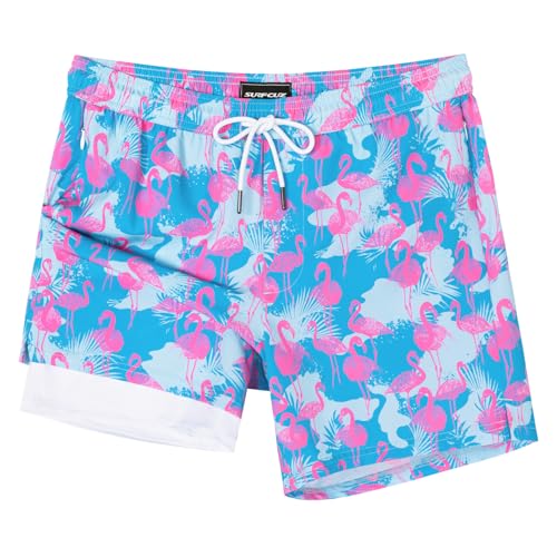 SURF CUZ Mens Swim Trunks with Compression Liner 5" Swim Shorts Quick Dry Bathing Suit Swimming Trunks Zipper Pockets Blue Block Flamingo XX-Large