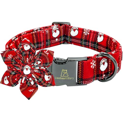 Lionheart glory Christmas Dog Collar with Flower - Red Christmas Plaid Dog Collar with Flower Santa Claus Soft Sturdy Adjustable Girl Boy Pet Collars for Medium Dogs Cute Collars