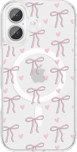 Houdqklee Magenetic Pink Bow Case Compatible with Magsafe for iPhone 16, Clear Phone Cover with Cute Pink Heart Pattern Soft TPU Hard Back Shockproof Protective Case for iPhone 16