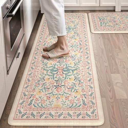 Collive Kitchen Mats Cushioned Anti Fatigue, Waterproof Kitchen Floor Mat Non Slip Desk Rugs Comfort Standing Rug, Pink Floral Carpets for Sink, Office, Laundry, Home Decor, 20" x 47" + 20" x 32"