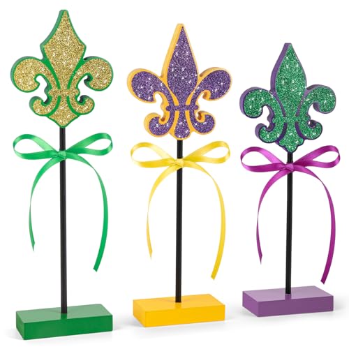 3 PCS Mardi Gras Table Decorations Wooden Fleur De Lis Set Glitter Mardi Gras Signs for Party Home Kitchen Decor (Fleur)