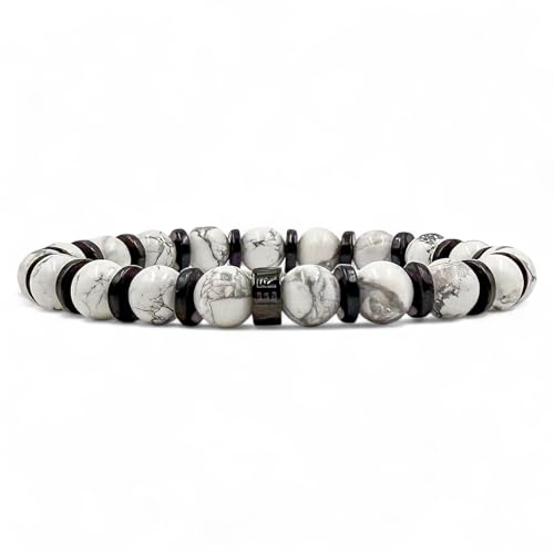 Everwood Rugged Gemstone Beaded Bracelet for Men - Wood Beads with Black Stainless Steel Spacer - Handmade Stretch Bracelet Gift for Him - Handcrafted Original (White Howlite)